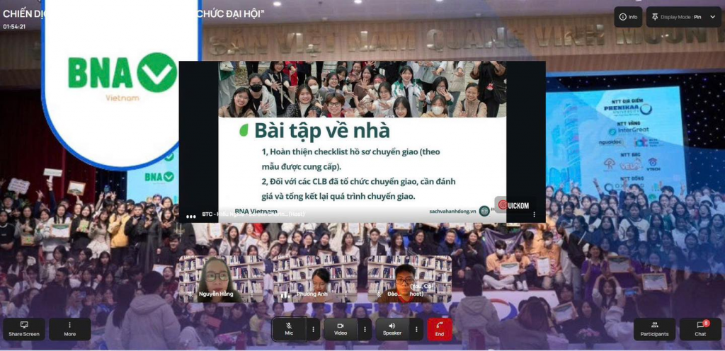 Mỗi CLB trong hệ sinh thái Sách và Hành động là một hành trình của sự kế thừa, nơi những thế hệ đi trước gửi gắm tâm huyết, kinh nghiệm và niềm tin cho lớp thành viên kế nhiệm. Với mong muốn giúp các CLB chuyển giao nhiệm kỳ một cách bài bản, chuyên nghiệp và đầy cảm hứng, Ban RnD – BNA Vietnam đã tổ chức thành công chuỗi đào tạo trực tuyến “Chuyển giao – Đại hội CLB” vào hai tối 15/6 và 22/6/2025.
