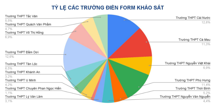 Tổng cộng, nhóm thực hiện đã tiếp cận 15 trường THPT, trong đó 12 trường được làm việc trực tiếp và 3 trường khảo sát trực tuyến. Đáng chú ý, khảo sát thu về 11.620 phiếu trả lời từ học sinh, tương đương hơn 60,17% tổng số học sinh THPT trong địa bàn. Trong đó nhiều nhất từ trường THPT Cái Nước với 1492 from (chiếm 12,8%), 10/15 trường có tỷ lệ học sinh điền khảo sát từ 60% trở lên. Quy mô này phản ánh tính đại diện cao và đảm bảo độ tin cậy cho kết quả nghiên cứu.